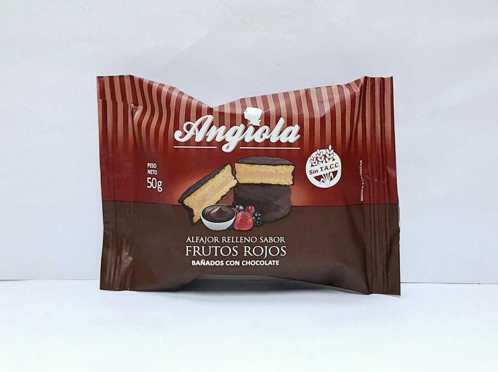 Ingredientes: Relleno sabor frutos rojos (azúcar impalpable, margarina, estabilizante: goma arábiga, antioxidante: vitamina C, saborizante artificial de frutos rojos, acidulantes: ac. málico, ac. cítrico, conservante: sorbato de potasio, colorante: carmín), baño de repostería, fécula de maíz, margarina, azúcar, fécula de mandioca, harina de arroz, agua, huevo, leche en polvo descremada, polvo para hornear (almidón de maíz, leudante químico: bicarbonato de sodio, bitartrato de potasio), antioxidante (vitamina C), estabilizante (goma arábiga), sal, esencia artificial de vainilla, conservantes: (propionato de calcio, sorbato de potasio). Contiene leche y huevo. Puede contener sulfitos, frutos secos, maní o derivados de soja.