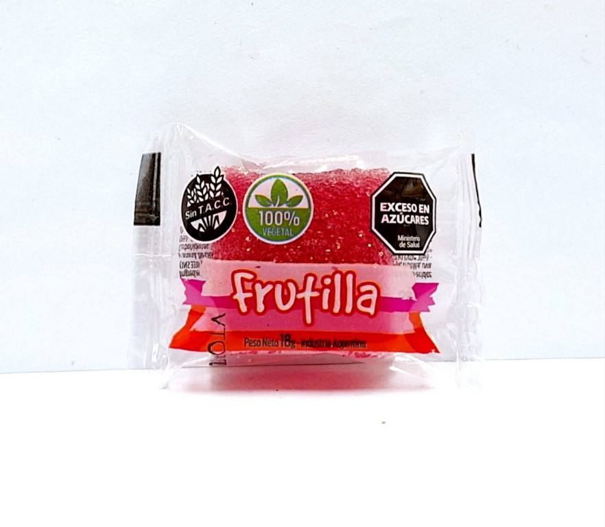 Ingredientes: Azúcar, glucosa, agua, estabilizante: pectina, acidulante: INS 330, regulador de acidez: INS 331ii, colorante: (INS 133, 124, tartrazina 102, 110), saborizante artificial a frutilla.