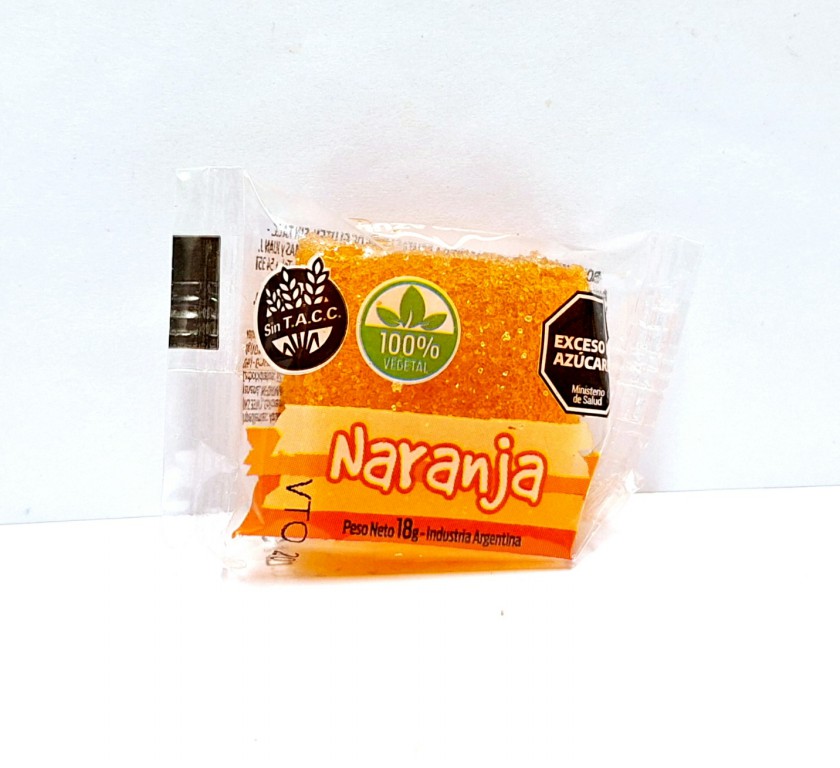 Ingredientes: Azúcar, glucosa, agua, estabilizante: pectina, acidulante: INS 330, regulador de acidez: INS 331ii, colorante: (INS 133, 124, tartrazina 102, 110), saborizante artificial a naranja.