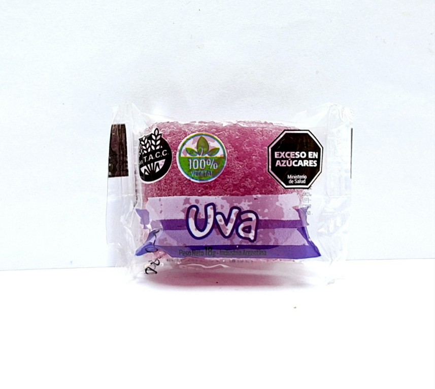 Ingredientes: Azúcar, glucosa, agua, estabilizante: pectina, acidulante: INS 330, regulador de acidez: INS 331ii, colorante: (INS 133, 124, tartrazina 102, 110), saborizante artificial a uva.
