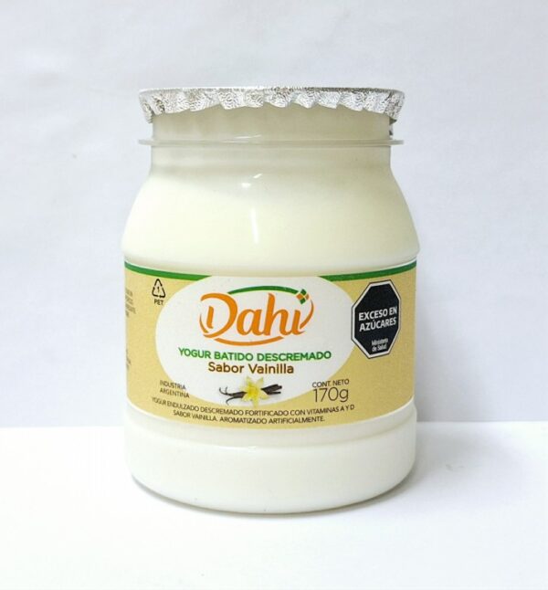 Ingredientes: Leche fluida descremada, azúcar, leche en polvo descremada, almidón, cultivos lácticos específicos, vitaminas A y D, estabilizantes: gelatina y pectina, saborizante: esencia artificial sabor vainilla.