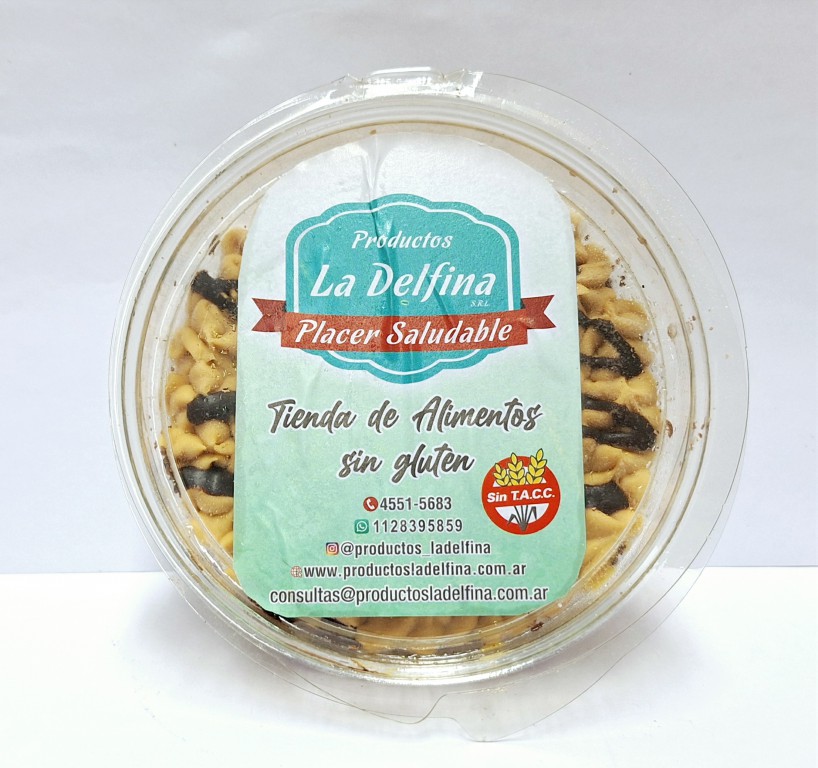 Ingredientes: Dulce de leche (leche, azúcar, glucosa, ESP (INS 406), CONS (INS 202)), Queso crema (Leche pasteurizada, crema, sólidos lácteos, EST (INS 415), ACI (INS 330), sal, COL (INS 171), CONS (INS 202), cuajo, fermentos lácteos), Baño de repostería semiamargo aromatizado con vainillina (EMU (INS 322), ARO (vainillina)), Huevo, Compuesto graso para repostería (EMU (INS 471), CONS (INS 202), REG ACI (INS 330), ANT (INS 321 Y 319), COL (INS 160 ai)), azúcar, almidón de maíz, leche fluida, harina de arroz, EMU (INS 471 y 472), ACI (INS 330), CONS (INS 282), CONS (INS 202), nueces.