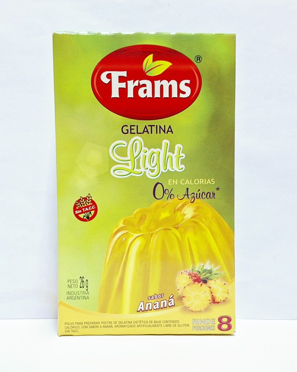 Ingredientes: Gelatina, maltodextrina, ACI: (INS 297), AGREG: (INS 331 iii), ARO: (art. ananá), EDU: (Aspartamo, INS 951), acesulfame de potasio (INS 950), COL (INS 102).
