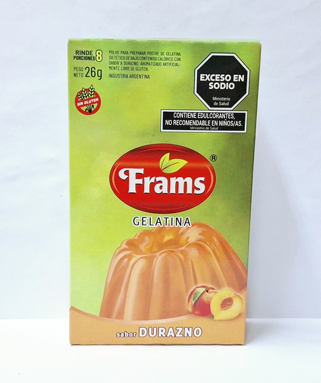 Ingredientes: Gelatina, maltodextrina, ACI: (INS 297), AGREG: (INS 331iii), ARO: (art. durazno), EDU: (Aspartamo, INS 951), acesulfame de potasio (INS 950), COL (INS 110, INS 123).