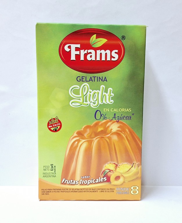Ingredientes: Gelatina, maltodextrina, ACI: (INS 297), AGREG: (INS 331iii), ARO: (art. frutas tropicales), EDU: (Aspartamo, INS 951), acesulfame de potasio (INS 950), COL (INS 110, INS 102).