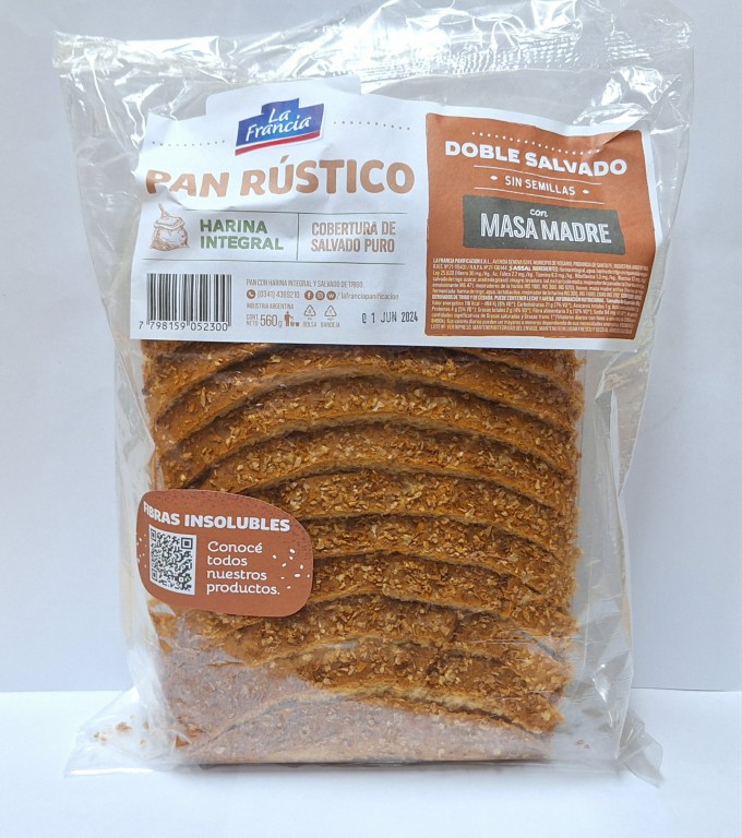Ingredientes: Agua, harina integral, harina de trigo enriquecida (hierro, ácido fólico, tiamina, riboflavina, niacina), salvado, aceite de girasol, sal, extracto de malta, mejorador de panadería (harina de trigo, emulsionante INS 471, mejoradores de la harina INS 1100, INS 300, INS 920), levadura, conservador INS 282, masa madre activa (harina de trigo fermentada, harina de trigo, agua, lactobacilos, mejorador de la harina INS 300, INS 1100). Contiene derivados de trigo y de cebada.