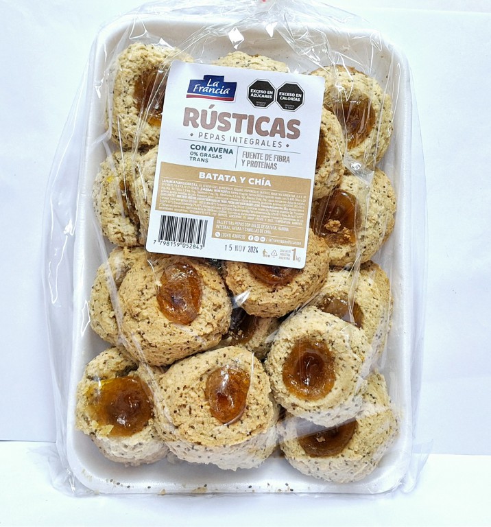 Ingredientes: Harina integral de trigo, harina de trigo enriquecida según ley 25630 (Hierro, ácido fólico, tiamina, riboflavina, niacina), agua, margarina, dulce de batata, azúcar, avena, semillas de chía, huevo en polvo, saborizante: esencia artificial de vainilla, leudantes químicos: INS 500ii y INS 450ii, CONS: INS 282.