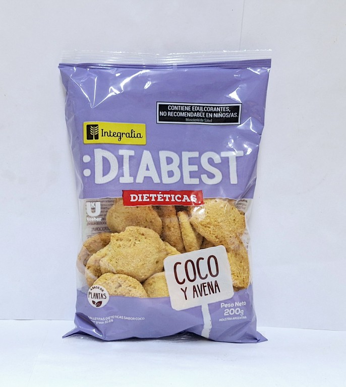 Ingredientes: Harina de trigo enriquecida según ley 25630, salvado de avena, aceite de girasol, coco rallado, humectante: sorbitol, fécula de maíz, emulsionante: lecitina de soja, leudante químico: INS 500ii, INS 450i, 341i, 341iii, aromatizante/saborizante. Edulcorantes no nutritivos: sacarina (19mg%g) y ciclamato (93mg%g). Contiene trigo, derivados de avena y de soja. Puede contener derivados de huevo.