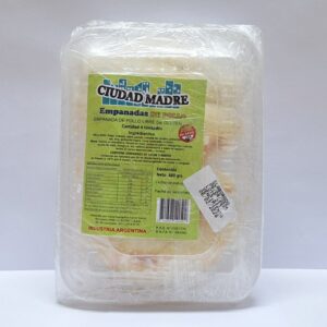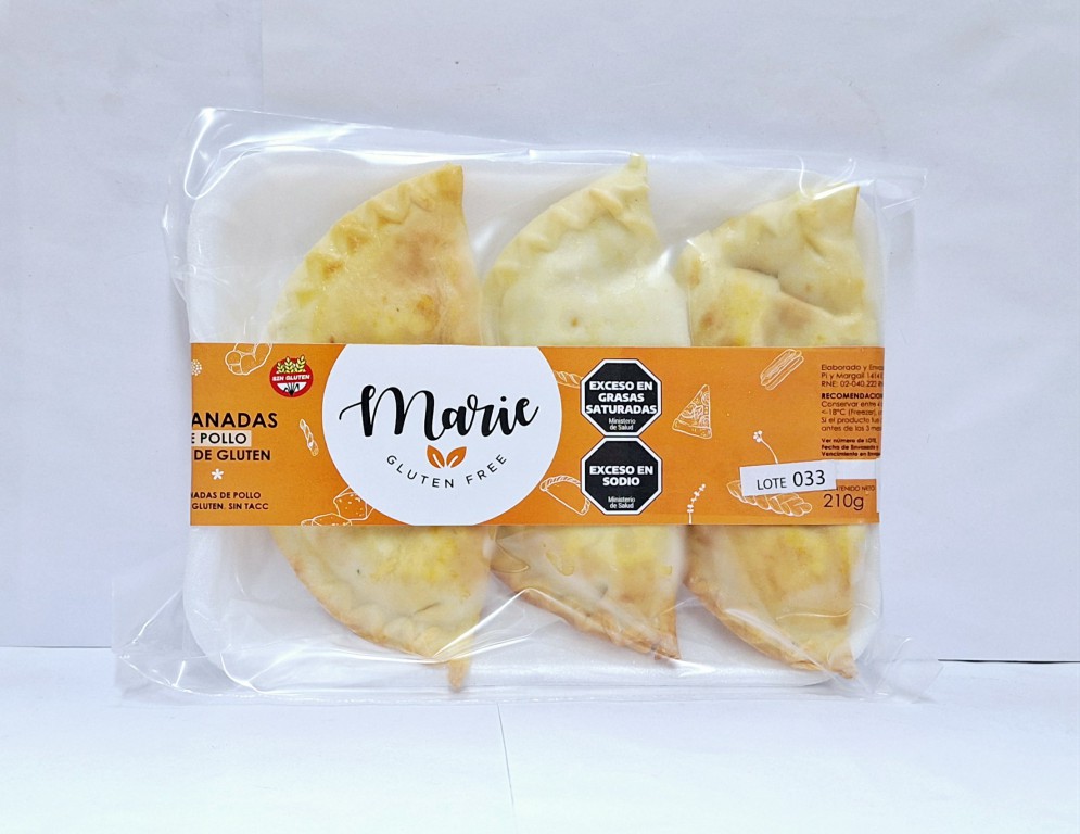 Ingredientes: Masa: Almidón de maíz, fécula de mandioca, harina de arroz, huevo, leche en polvo descremada, aceite de girasol, polvo de hornear, sal, goma xántica (E415). Relleno: Pechuga de pollo, aceite de girasol, cebolla, morrón, sal, pimienta. CONTIENE LECHE Y HUEVO.