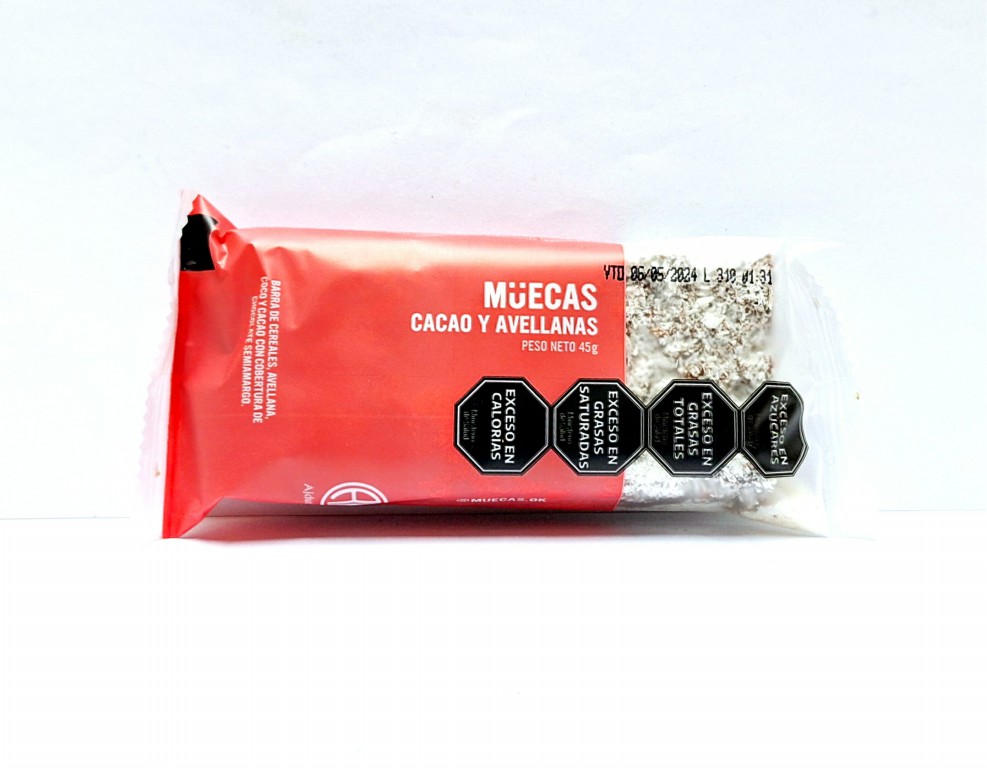 Porción: 1 barrita. Valor energético: 195 kcal. Carbohidratos: 25.0g. Proteínas: 5.0g. Grasas totales: 8.6g. Grasas saturadas: 3.4g. Grasas trans: 0.0g. Fibra; 3.7g. Sodio: 25 mg.