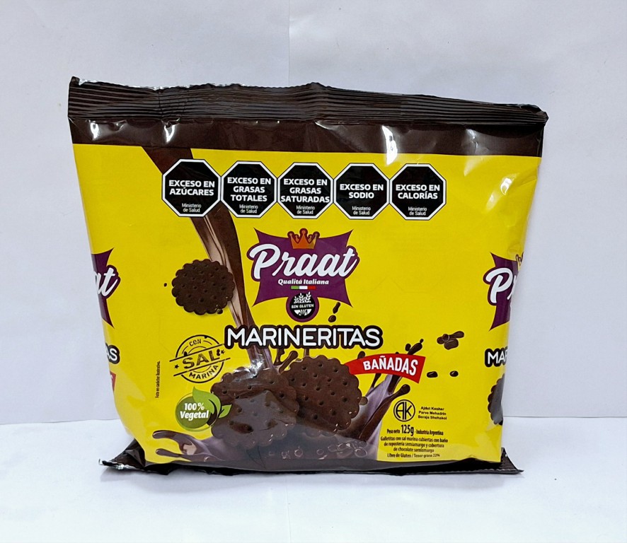 Ingredientes: Baño de repostería semiamargo (EMU: (INS 322, INS 442, INS 476), ARO, harina de arroz, almidón de maíz, cobertura de chocolate semiamargo (EMU INS 322), ARO, aceite de girasol alto oleico, azúcar invertido, fécula de mandioca, sal, azúcar, sal marina, EMU: INS 322. ESP: INS 415, RAI: (INS 500ii, INS 503ii). Contiene derivados de soja. Puede contener leche, huevo, almendras, nueces, castañas de cajú y maní.