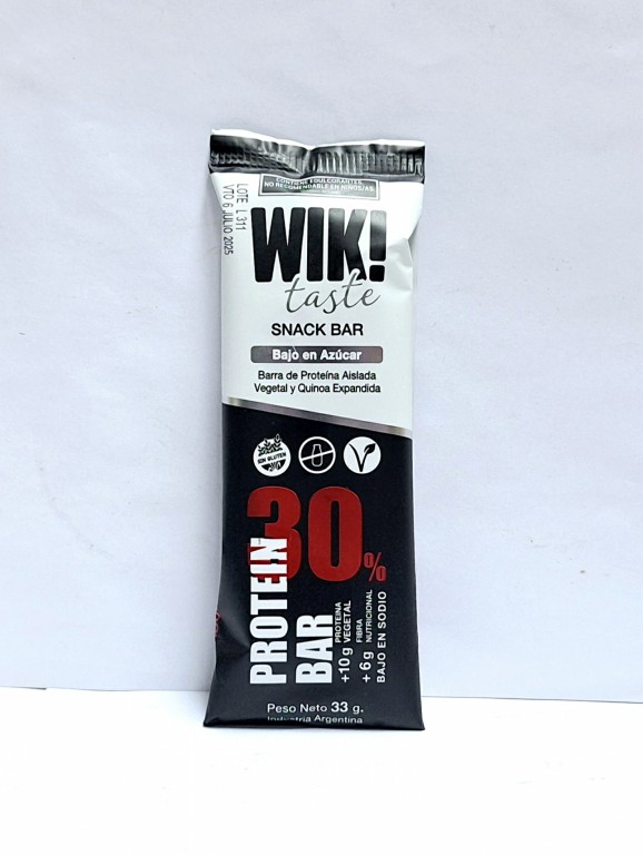 Ingredientes: Proteína aislada de lupino, sorbitol vegetal, texturizado de arvejas, polidextrosa vegetal, quinoa expandida, levadura nutricional, maní tostado, proteína aislada de arvejas, fibra de achicoria, chocolate bajo en azúcar (licor de cacao, cacao alcalino en polvo, manteca de cacao, EDU: INS 965 – INS 960 esteviol glicósido (40mg/100g)), EMU: INS 476. CONTIENE MANÍ.